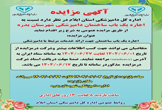 آگهی مزایده اجاره یک باب ساختمان دامپزشکی بدره جهت انجام خدمات مرتبط با امور دامپزشکی