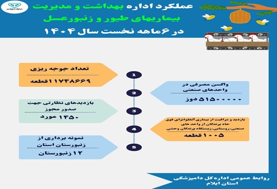 اینفوگرافی عملکرد اداره بهداشت و مدیریت بیماریهای طیور و زنبور عسل در ۶ماهه نخست سال ۱۴۰۴ کپی لینک کوتاه گروه خبری : گروه های مطالب,اخبار اسلایدر کد خبر : 346551 کلمات کلیدی