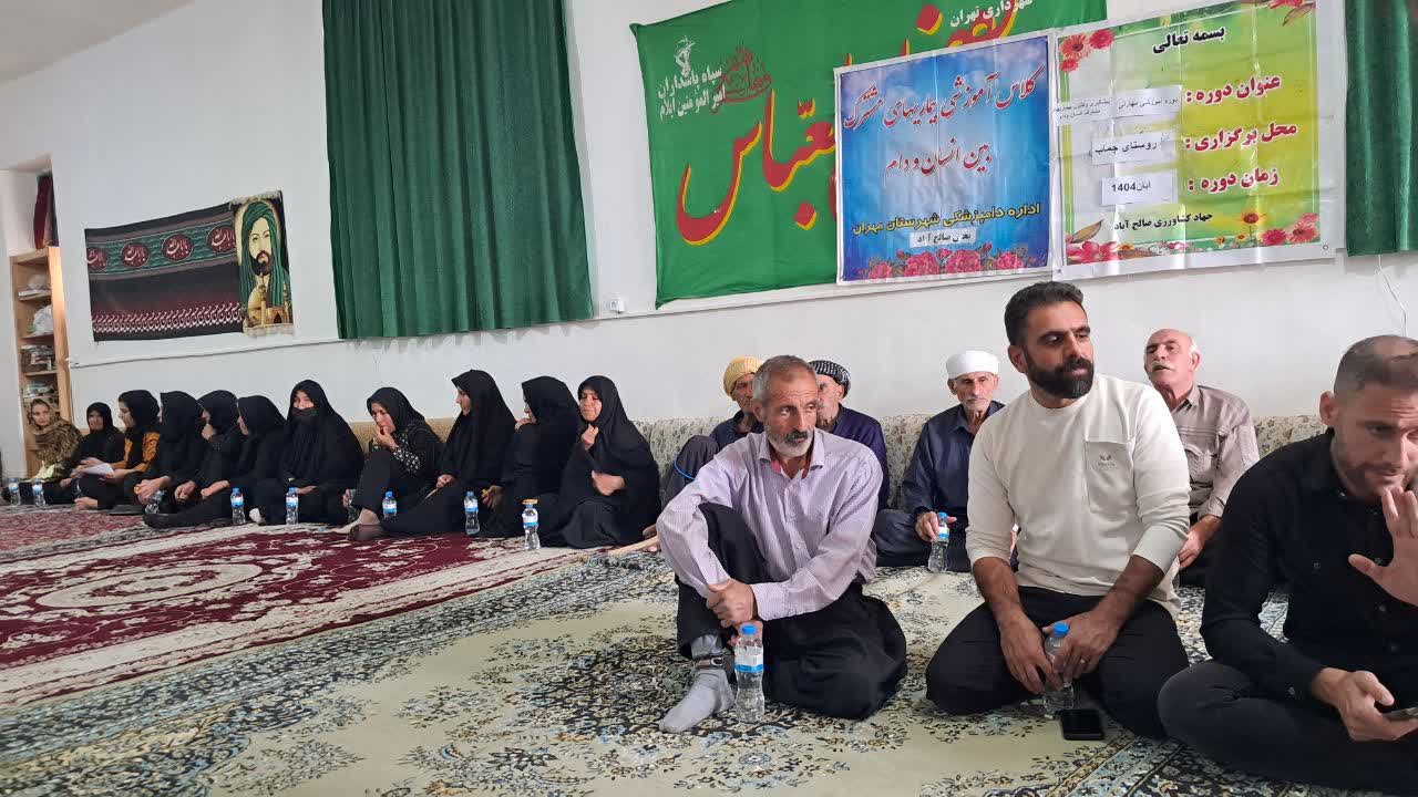 این برنامه با حضور دامداران و روستاییان منطقه و با هدف ارتقای سطح آگاهی جامعه هدف در زمینه پیشگیری و کنترل بیماری‌های مشترک بین انسان و دام برگزار گردید.در این دوره آموزشی، کارشناسان دامپزشکی ضمن معرفی بیماری‌های مهمی همچون تب مالت، هاری، تب کریمه-کنگو، شاربن (سیاه‌زخم) و کیست هیداتیک، بر اهمیت رعایت اصول بهداشتی در دامداری‌ها، واکسیناسیون به‌موقع دام‌ها و پرهیز از مصرف فرآورده‌های خام دامی تأکید کردند.در پایان، رئیس اداره دامپزشکی شهرستان مهران با قدردانی از همکاری اداره جهاد کشاورزی، بر تداوم برگزاری چنین دوره‌هایی تأکید کرد و هدف از اجرای آن‌ها را «تأمین سلامت عمومی جامعه و تولید فرآورده‌های دامی سالم» عنوان نمود.